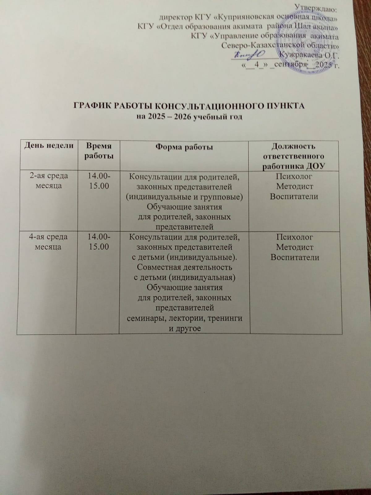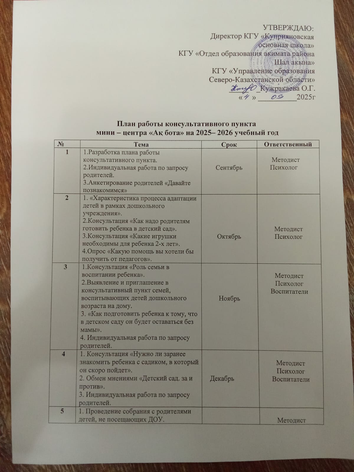 "Куприяновка негізгі мектебі" КММ жанындағы "Ақ-бота" шағын орталығында консультациялық пункт жұмыс істейді.Ата-аналармен танысу мақсатында сауалнама жүргізіп, жұмыс жоспарымен таныстырды.