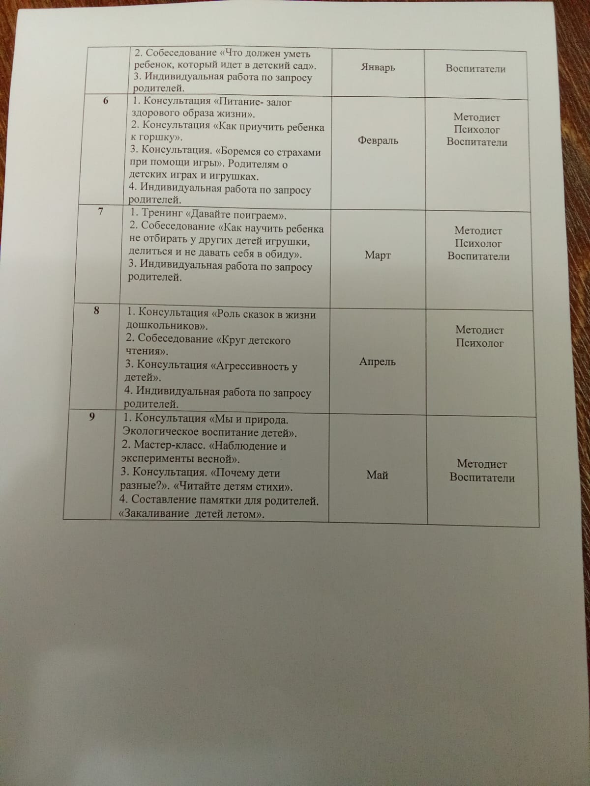 2. Мектеп жасына дейінгі балаларды үйде тәрбиелеп отырған отбасыларды анықтау және шақыру. Балаларды үйде, мектепке дейінгі мекемеден тыс жерде тәрбиелеп отырған отбасыларды анықтау бойынша жұмыс жүргізілді. Әлеуметтік қызметтермен және ата-аналар қоғамымен өзара іс-қимыл арқылы ақпарат жиналып, ата-аналарға ақпарат берілді. Отбасылар әдістемелік, психологиялық және педагогикалық көмек алу үшін консультативтік пунктке шақырылды.
